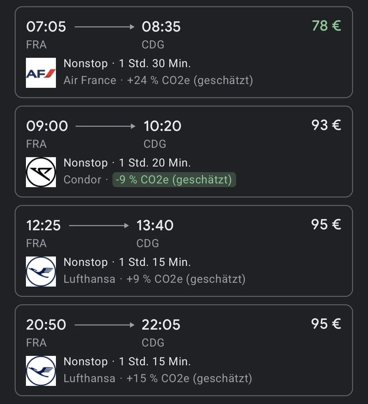 Ich mache mich auf die Suche nach Alternativen. Da bekanntermaßen Frankfurt und Paris beide eine sehr gute Fluganbindung haben, schaue ich nun dort. Und zack - das Angebot ist da. Stündlich Flüge von 6 Uhr morgens bis 23 Uhr abends - direkt zwischen den beiden Metropolen. Der Preis - für Economy - zwischen 60 und 100 Euro und Flugzeit bei ca. 1h 20. Das hört sich gut an.